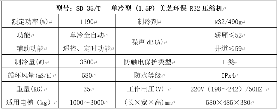 8、选择性强,针对大小不同的轿厢载重量与不同的轿厢环境,公司分别研制出 1 匹单冷型、1.5 匹单冷型、1 匹冷暖型、1.5 匹冷暖型空调,客户可根据自身的轿厢条件选择不同规格型号的电梯空调;